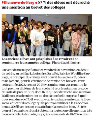 Construit en 1973, le collège porte le nom de Joseph Louis de Laboissière, avocat général au Parlement du Dauphiné, né à Villeneuve de Berg en 1749.